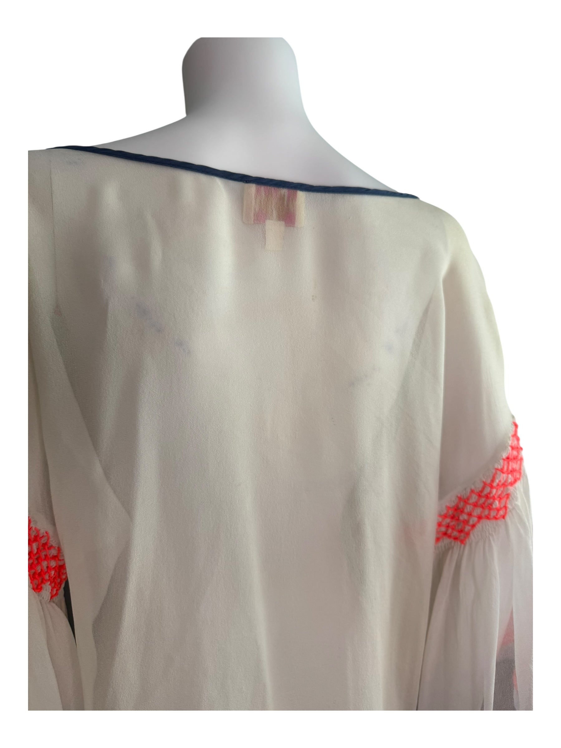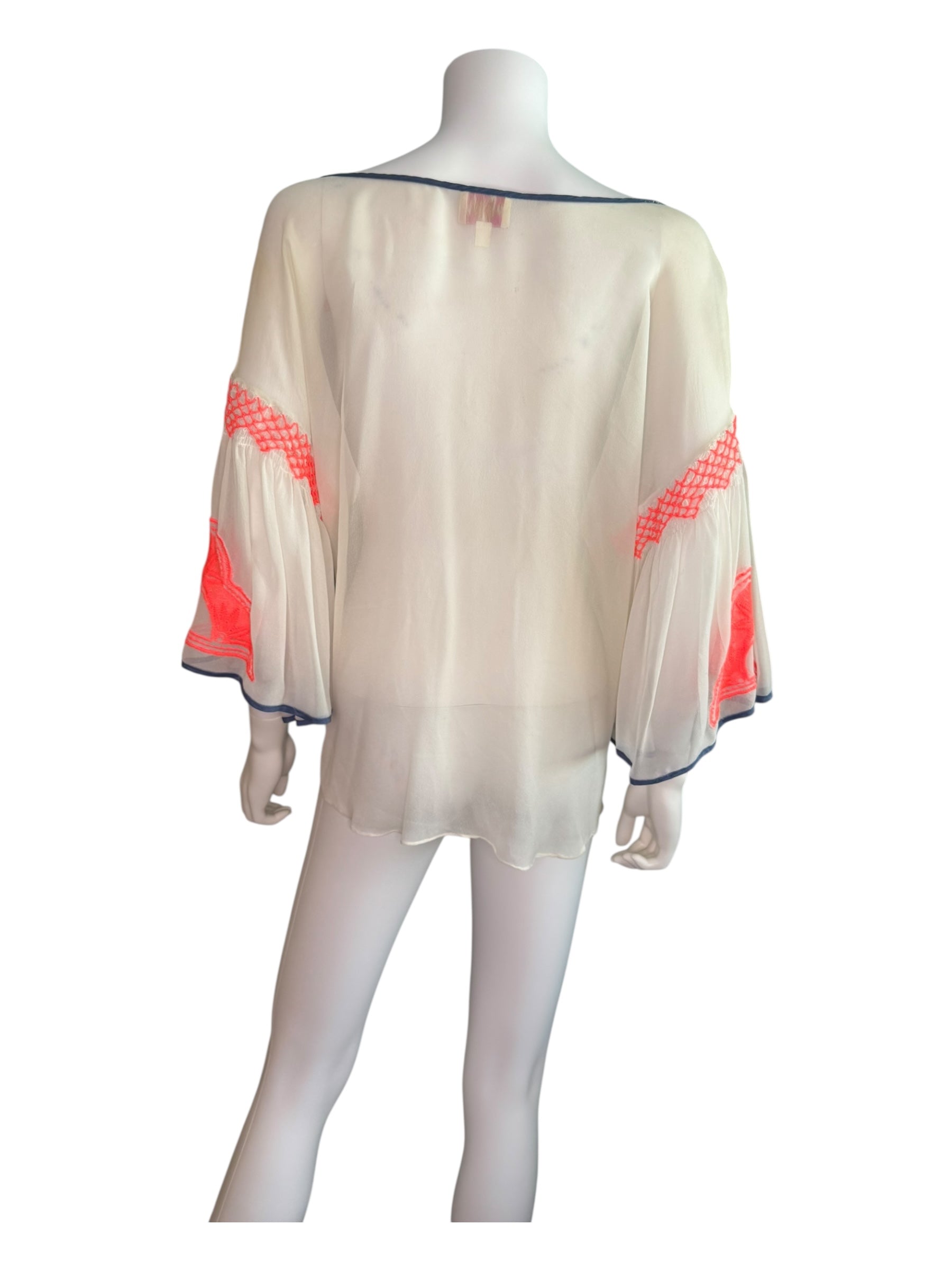 This Plenty by Tracy Reese blouse in size Medium features vibrant bright orange embroidery that adds a distinctive touch to its design. Please note it is sold as-is, with minor color bleed from the piping visible on the back, reflecting its unique character. Ideal for those who appreciate expert craftsmanship with a hint of individuality.